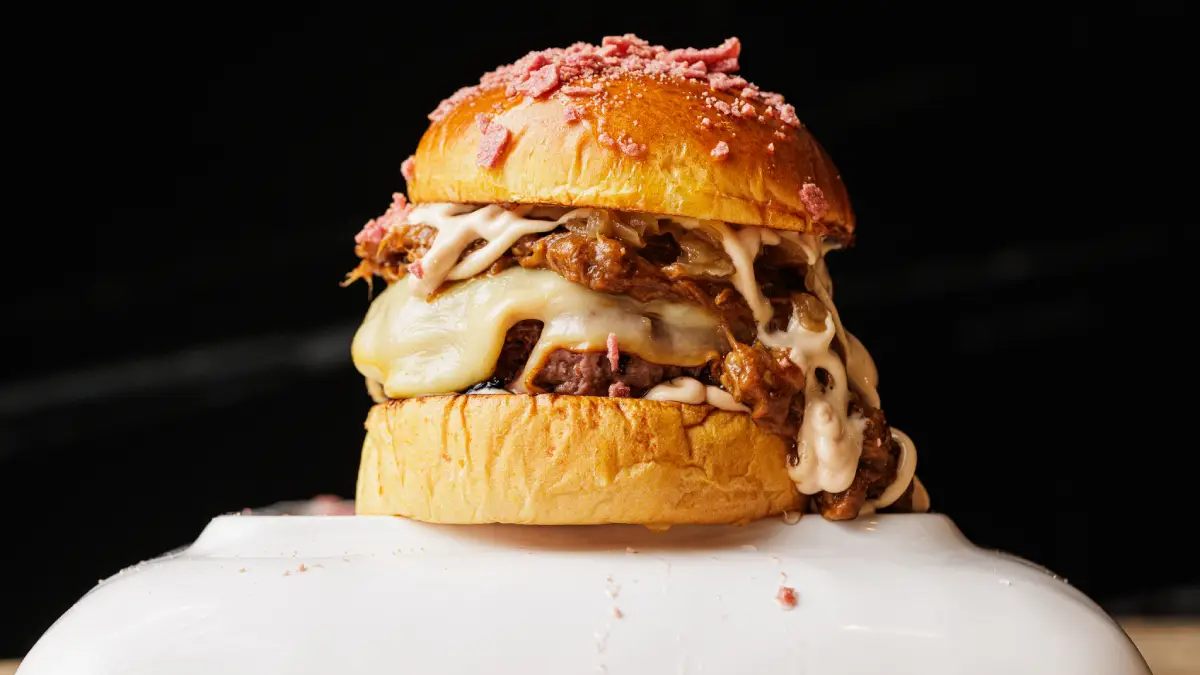 Doble carne smash, doble de cheese y bacon con salsa secreta (solo se sirve muy hecha)