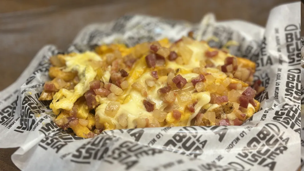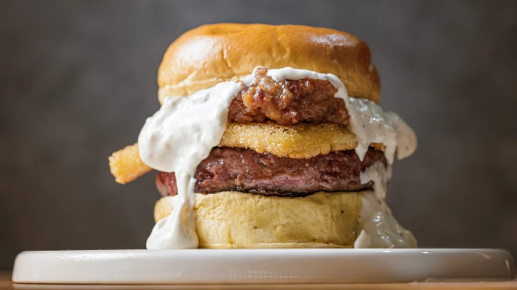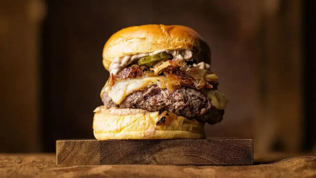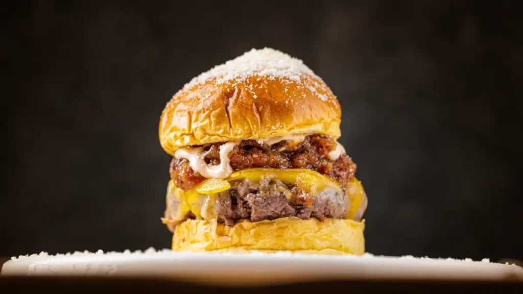 Carne de chuleta madurada, pulled pork, queso ahumado, cebolla caramelizada, salsa Carnívora y polvo de bacon ahumado.