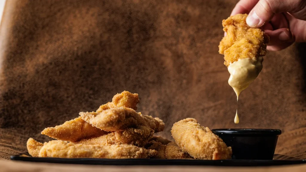 Deliciosos bocados de pollo súper crujientes con salsa bbq casera.