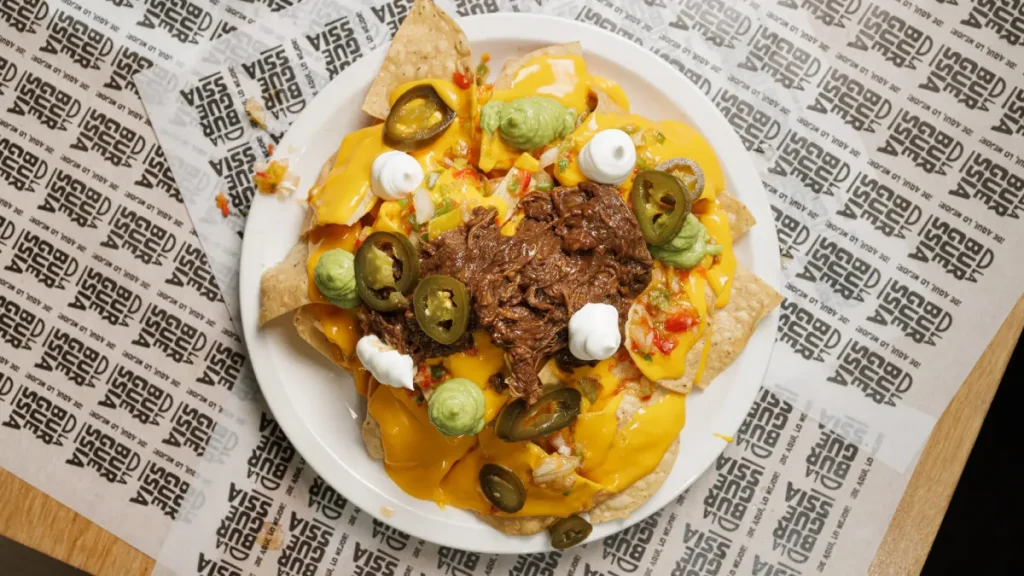Totopos caseros, pico de gallo, pulled pork, crema agria, salsa de Cheddar, aguacate y jalapeños.